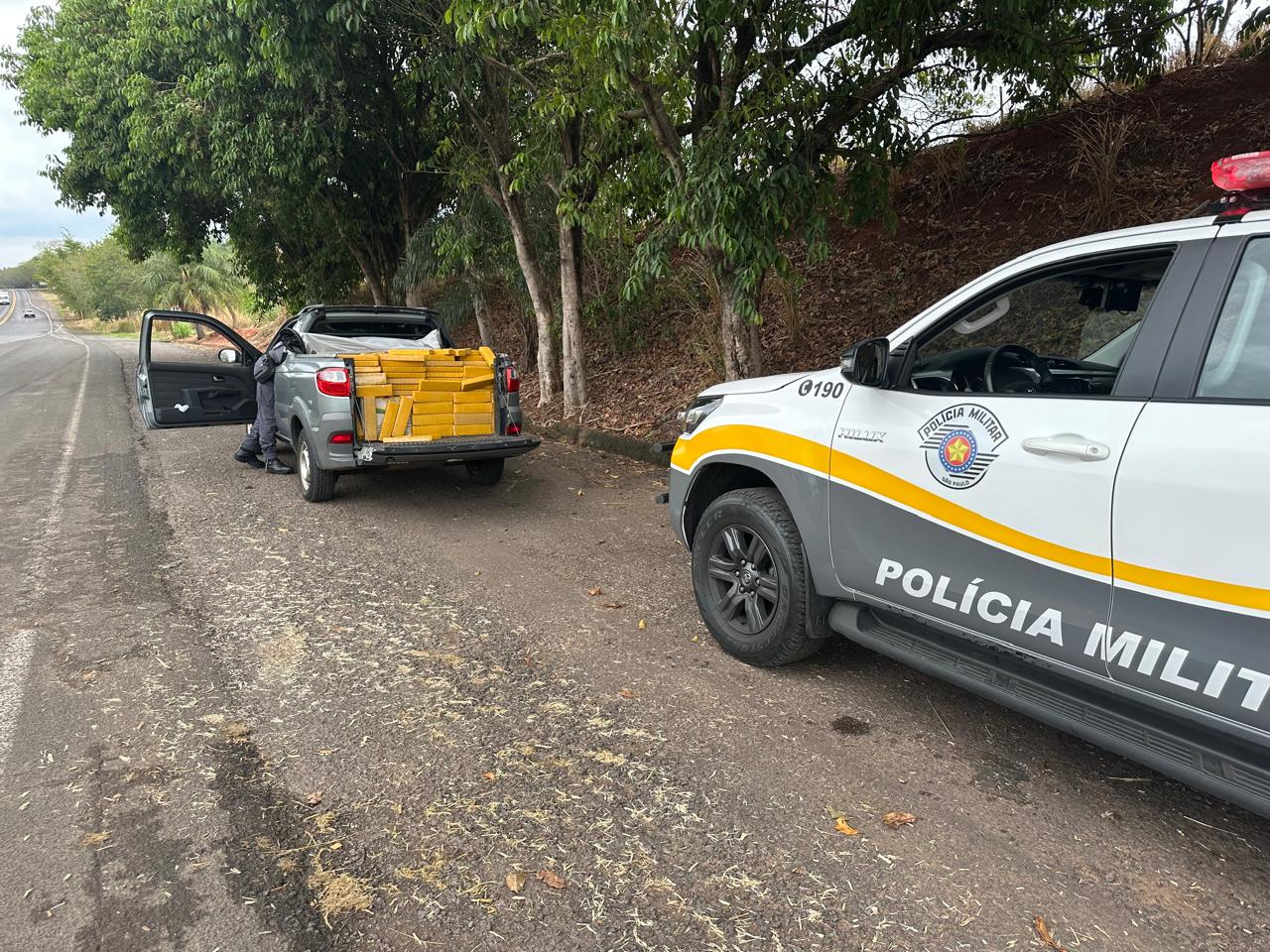 Na manhã desta terça-feira (14), durante Operação Impacto em ação em conjunta com a FICCO-SP, equipe da Polícia Militar Rodoviária, durante diligência abordou um veiculo Fiat Stada, cor cinza ocupado pelo condutor e um passageiro o qual transportava no seu interior 02 placas veiculares originais do veículo sendo que as placas fixadas no veículo eram falsas, enquanto no compartimento de carga e atrás do banco do motorista foi localizado grande quantidade de entorpecente totalizando 710,365 kg (setecentos e dez quilos, trezentos e sessenta e cinco gramas) de maconha e derivados da mesma droga.
